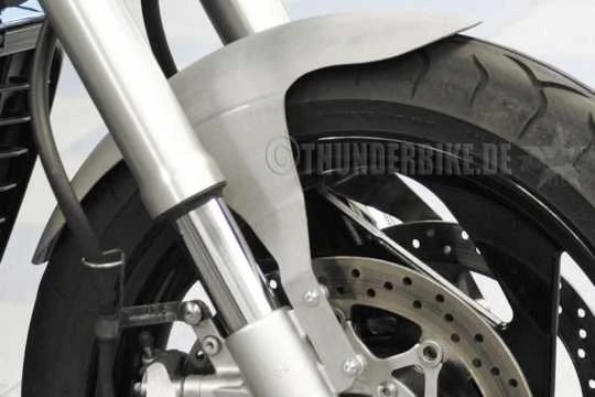 - Spezielles Vorderradschutzblech mit seitlicher Befestigung, wird ungebohrt und unlackiert geliefert